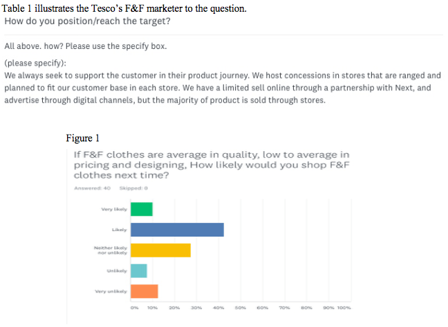 Females are mainly the consumers of F&F products aged between 18 and 45 years old. As per the primary research, the F&F marketer said that the F&F’s are available at NeXTs’ stores and large Tesco supermarkets, but they aren’t available for online shopping “only some limited clothing are sold online via NeXTs’ online shopping facility”, see table 1 (Hooper, 2020). And, according to the primary research one of the questions is, would the customers buy F&F clothing if the prices are low to average and average in quality? 10% answered very likely and 42.50% answered likely (see figure 1).